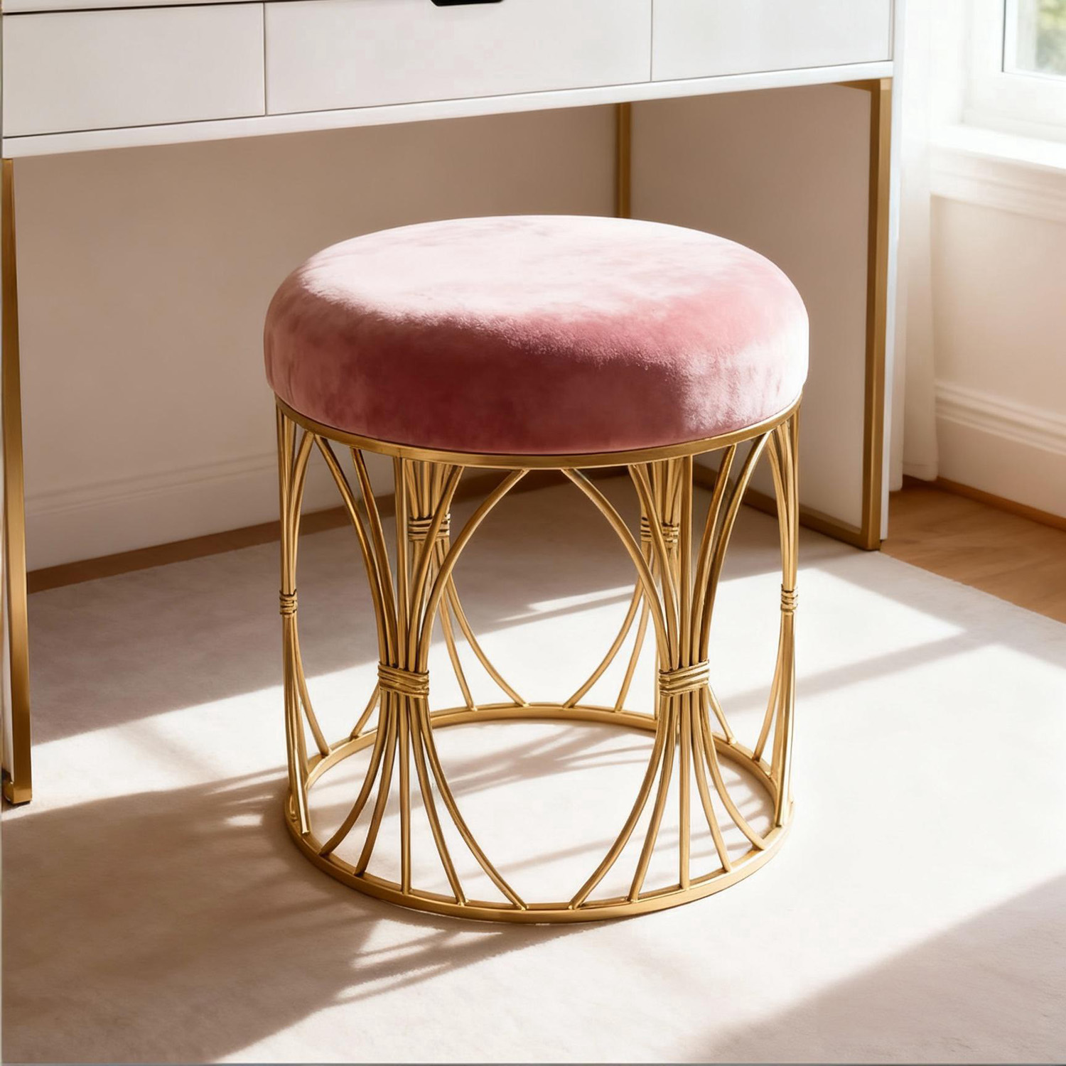 Handmade Pink Velvet footstool ottoman with Gold Metal Base 41Dx43H Centimeters