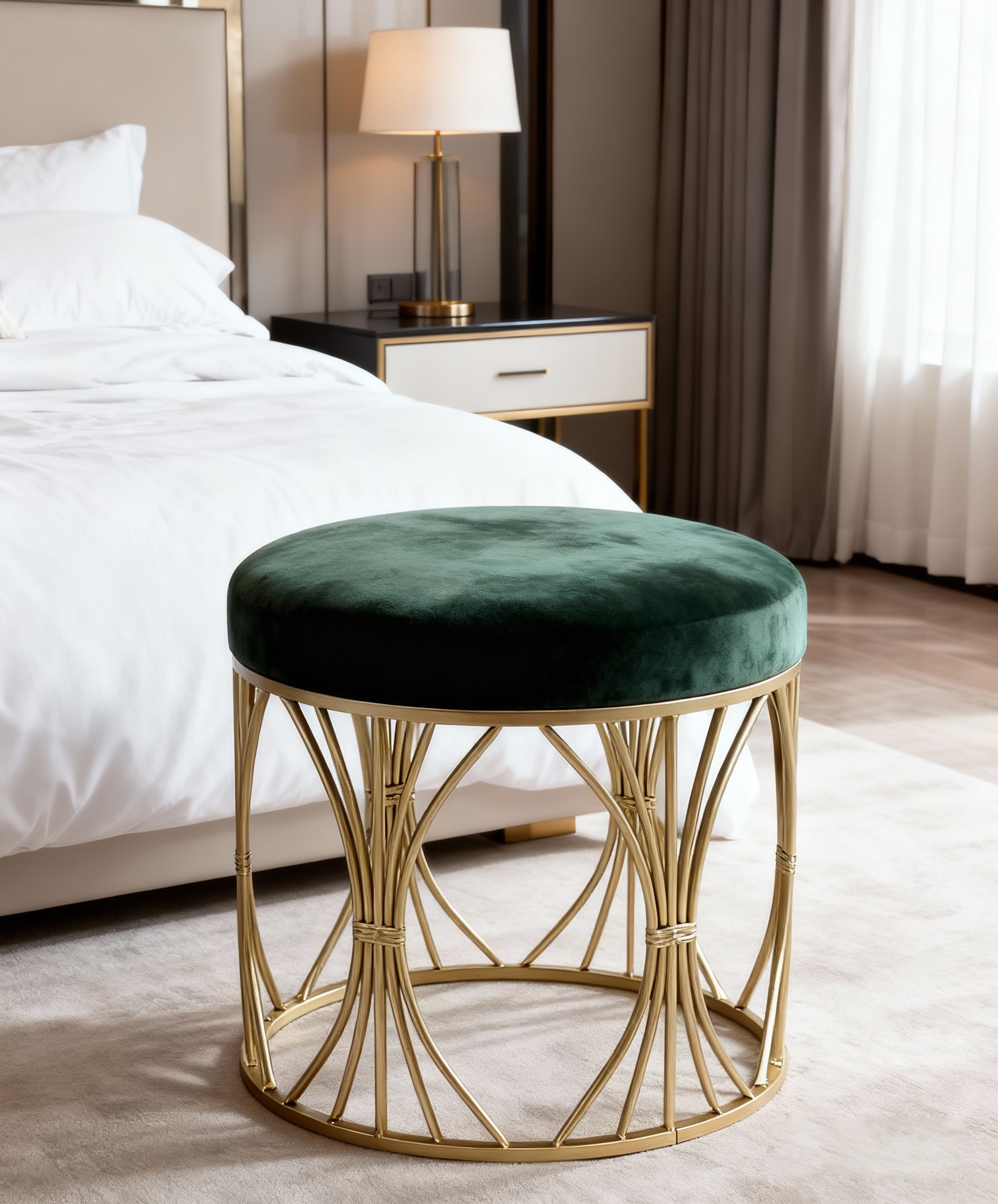 Handmade Green Velvet footstool ottoman with Gold Metal Base 41Dx43H Centimeters