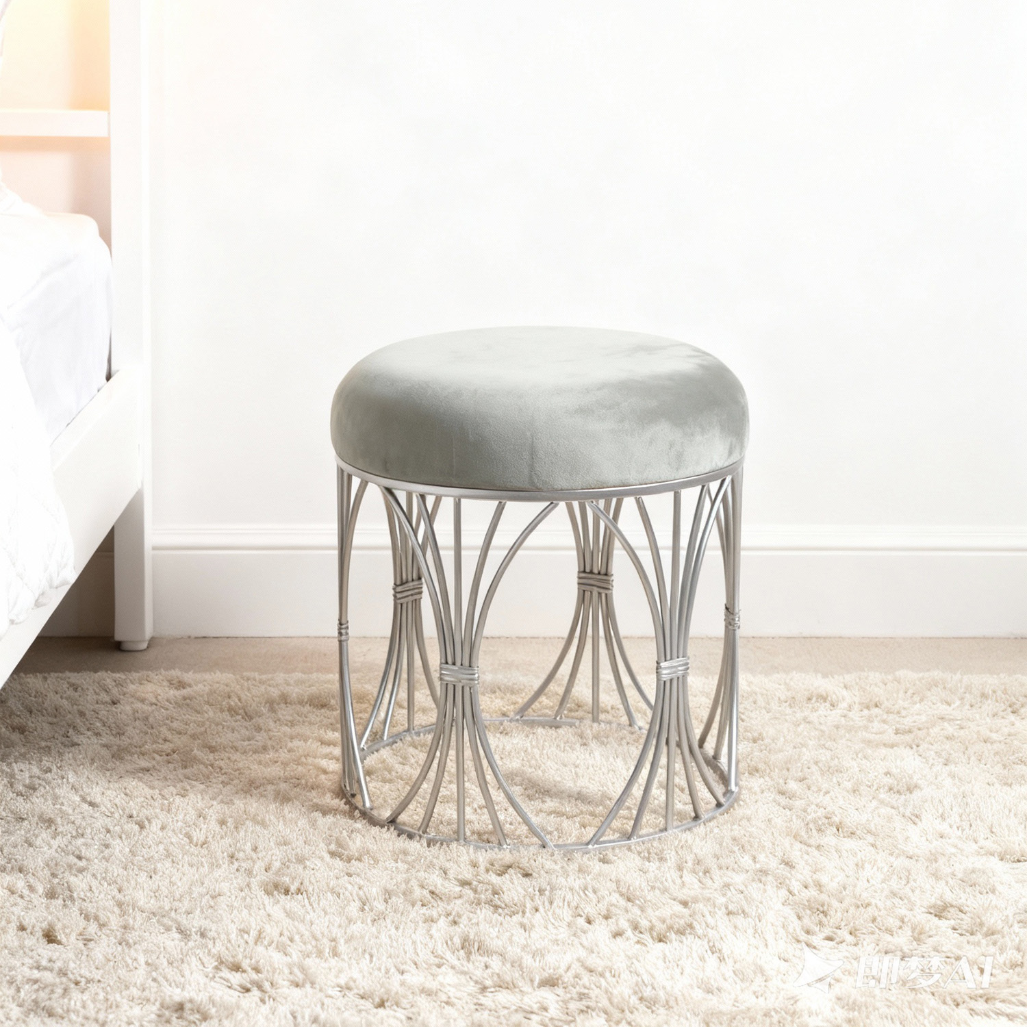 Handmade round vanity stool with silver metal Base Grey velvet 41 X 43H